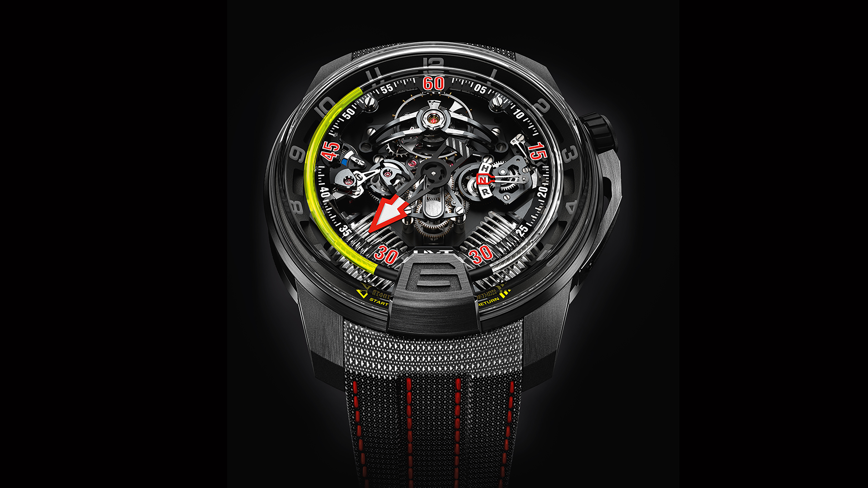 Dial: unstructured, fluid hours - Black aluminum hour dial; charcoal grey numerals - Sapphire minute dial, black rhodium minute hand with a red arrow, white indexes and every 15 minutes red numerals 15, 30, 45, 60) - Luminescent minute hand and hour-markers